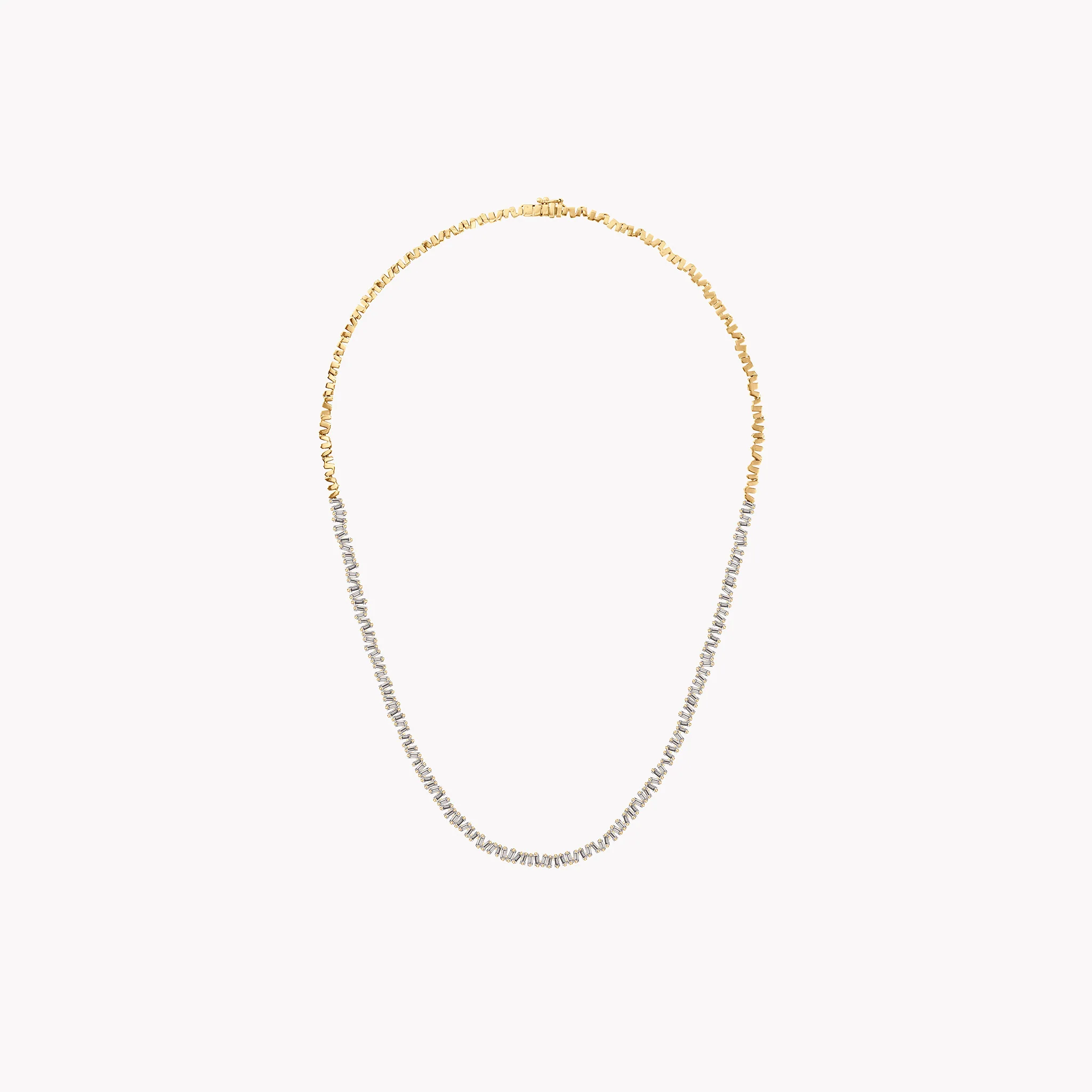 Tennis necklace with 5.15 carats of baguette cut diamonds sitting flush against the neck, handcrafted in 18K white, rose, or yellow gold. Note the unique artistry of Suzanne Kalan’s signature Fireworks setting, an asymmetrical pattern that draws the eye to each individual stone’s beauty. Day or night, this decadent piece anchors any look in modern sophistication.