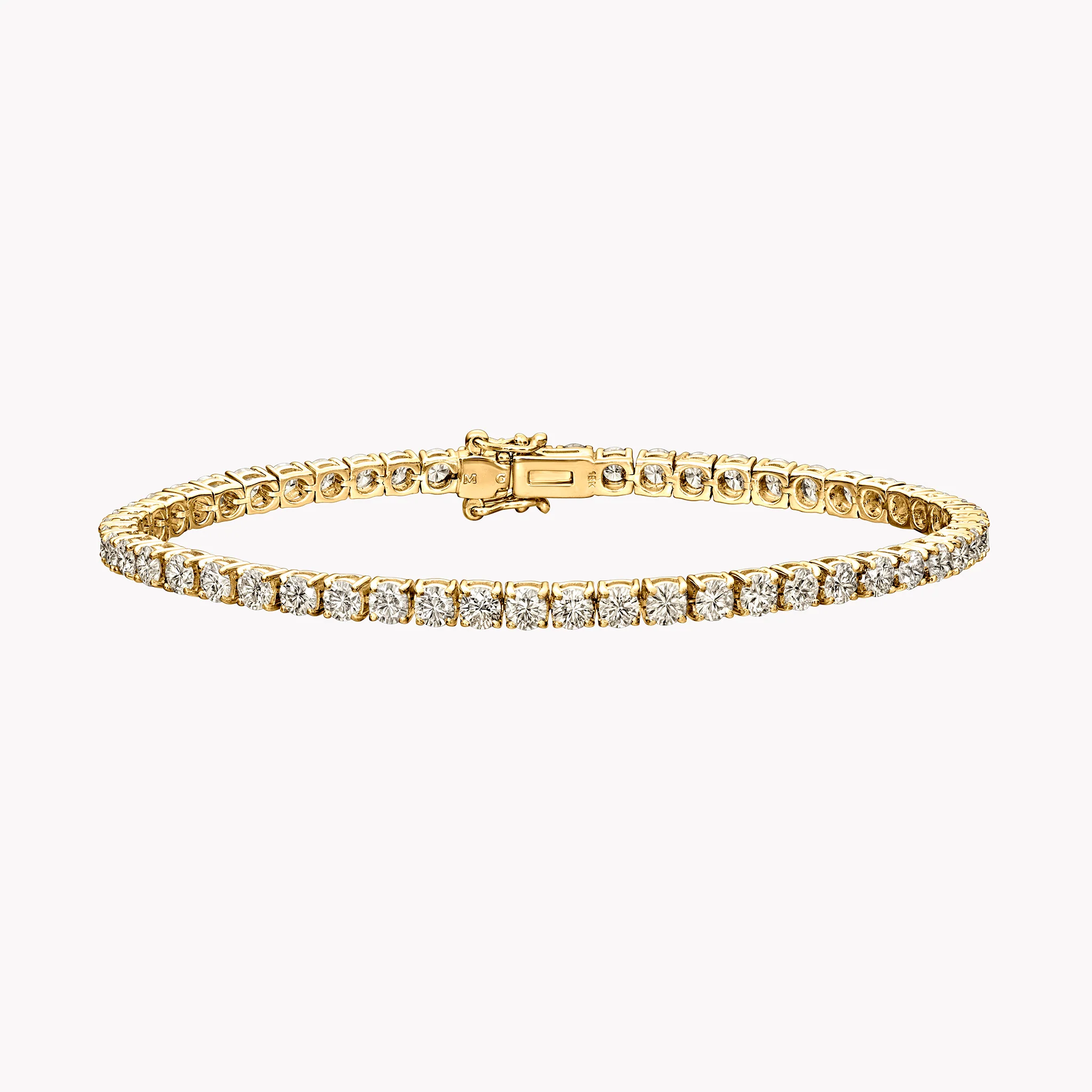 This tennis bracelet is prong set with 54 round brilliant cut diamonds, weighing approximately 0.10 carats each.
