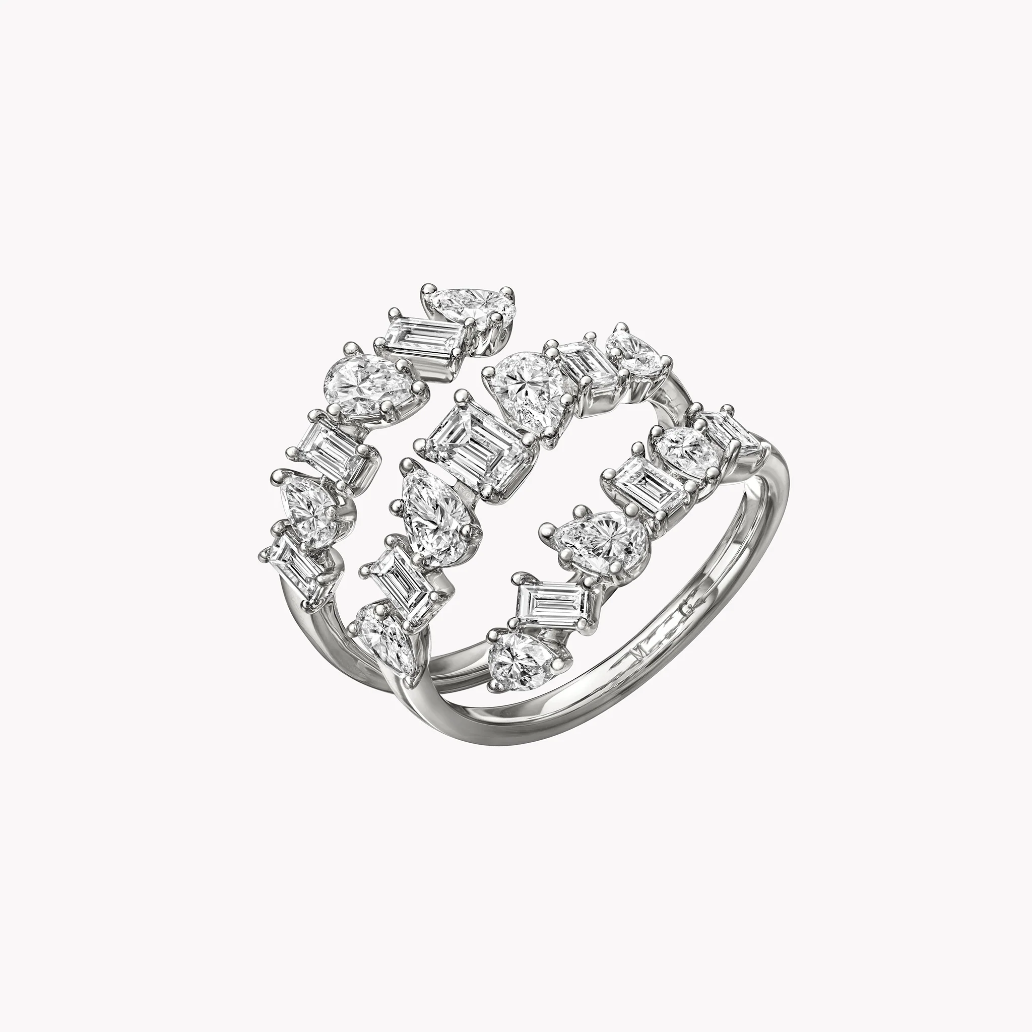 Elegant spiral ring featuring 19 emerald and pear-shaped diamonds that gracefully wrap around your finger. A signature design for any occasion.