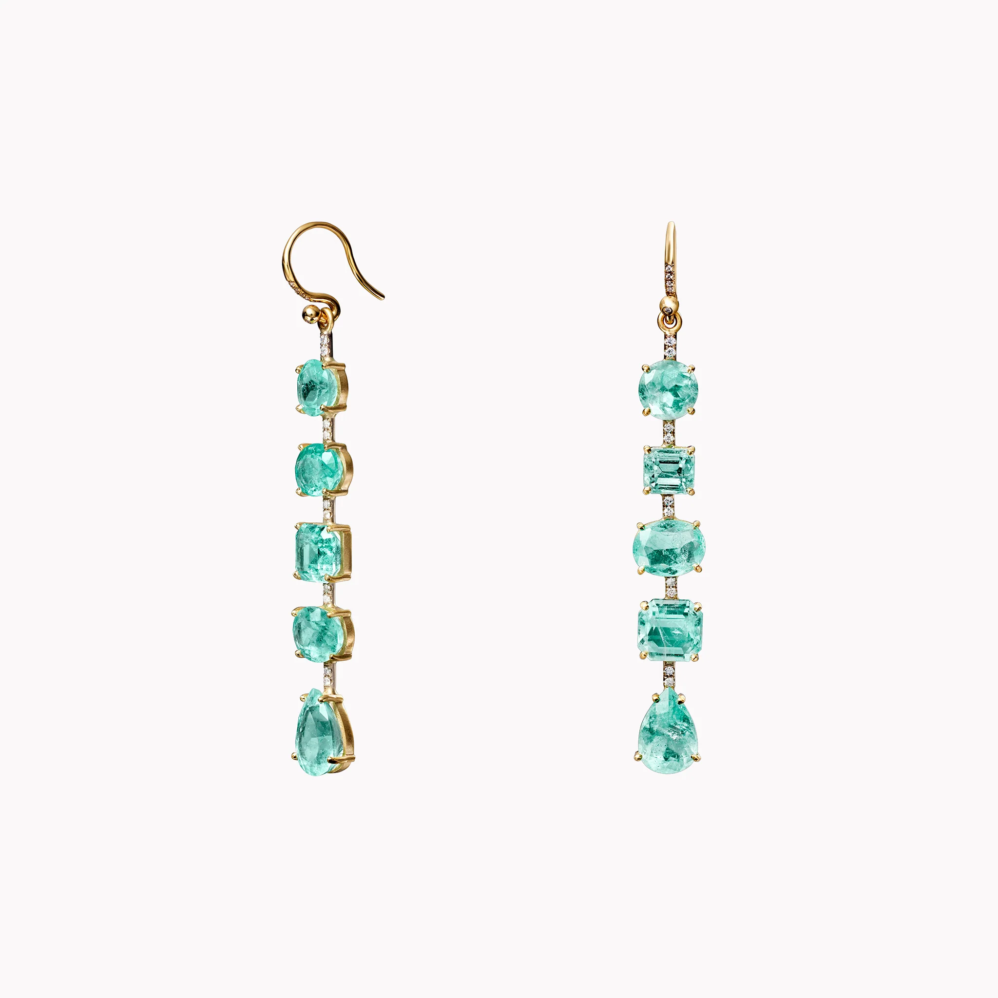 One-of-a-kind mixed shape Colombian emeralds suspended in 18K yellow gold with pavé diamond hooks for extra brilliance. This elegant design spotlights the luminous beauty of each light green emerald, as if each stone was lit from within. Part of Irene Neuwirth’s Gemmy Gem collection, known for vibrant handmade pieces that fuse elegance with a touch of play.
