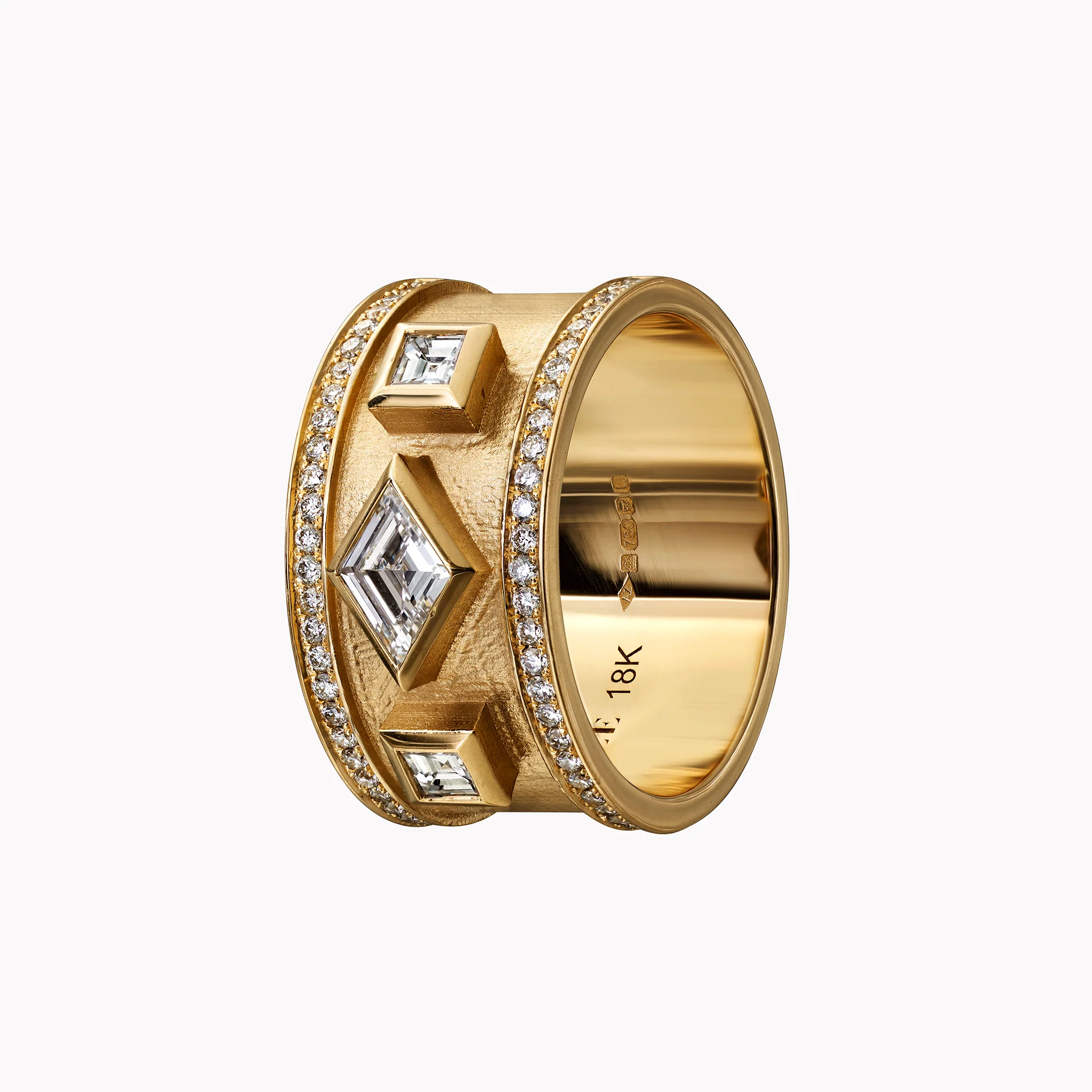 This ĀZLEE band highlights the rare lozenge cut diamond, centered between carre white diamonds, with pavé diamonds lining the wide 18K yellow gold band. Three-dimensional and totally unique, this is a band an architectural statement piece.