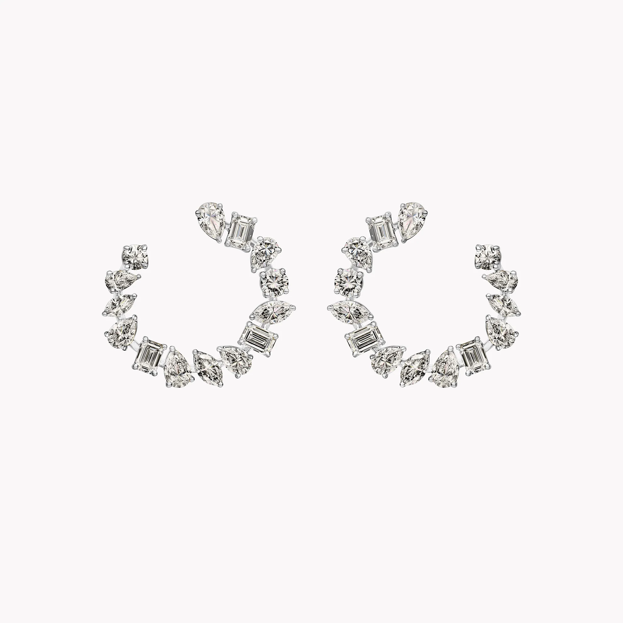Part of the Material Good signature collection, these unique hoops feature 30 multi-shape diamonds that wrap around the ears in 18K white, yellow, or rose gold. The versatile half-inch diameter is perfect for effortless transitions from day to night.Â
