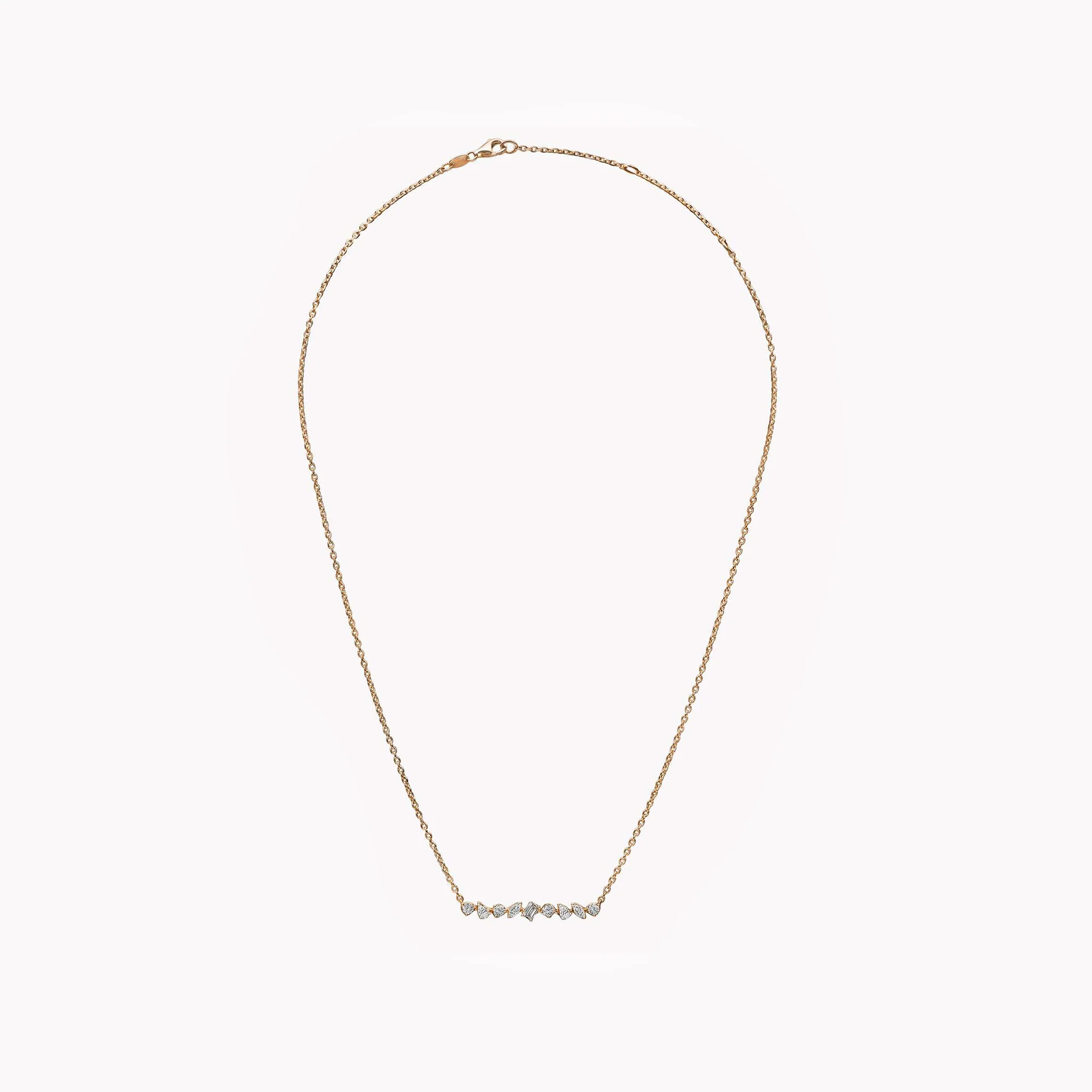 Multi-shape bar pendant necklace with 0.60 carats of fancy shape diamonds held in 18K white, yellow, or rose gold. The delicate pendant lays flush against the chest, floating on an adjustable chain that can be styled at different lengths.