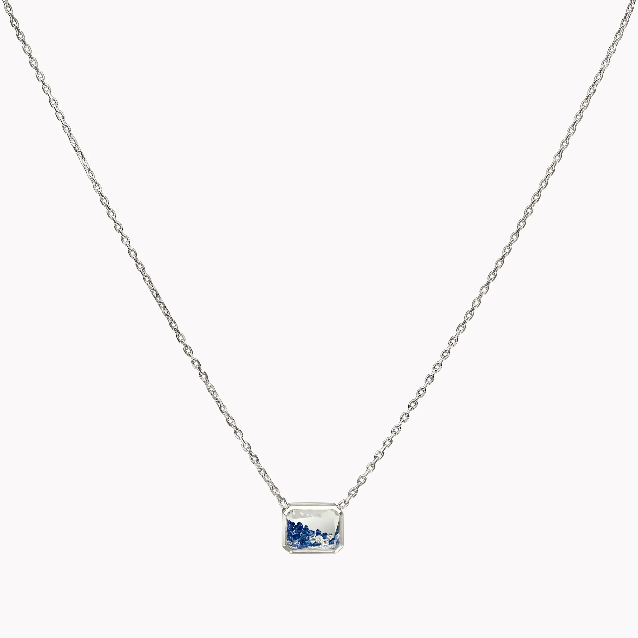 Elegant necklace featuring floating blue sapphires and white diamonds within an elegant sapphire crystal shaker. This signature Moritz Glick pendant is framed by 18K yellow, white, or rose gold on an adjustable 15.5 inch chain. Add a shimmering touch of mystery to your stack with this eye-catching pop of blue.