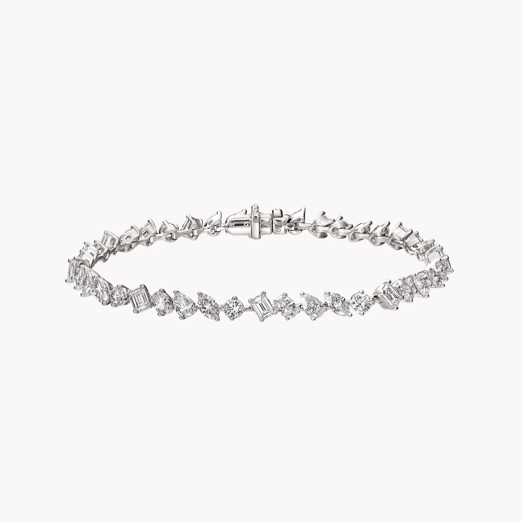 Our reimagined take on the classic tennis bracelet, with 38 fancy shape diamonds suspended in 18K white, rose, or yellow gold. Infinitely versatile, this bracelet makes a striking & playful addition to your repertoire.