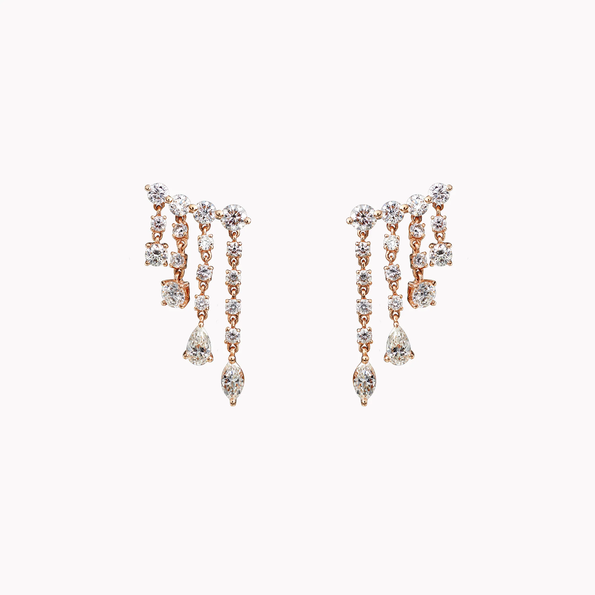 These 18K white, yellow, or rose gold earrings feature four rows of stunning diamonds, showcasing marquise, pear, and round cut stones. This luminous design echoes the captivating sight of rain cascading down. Each diamond shimmers with you, catching the light with your every move.