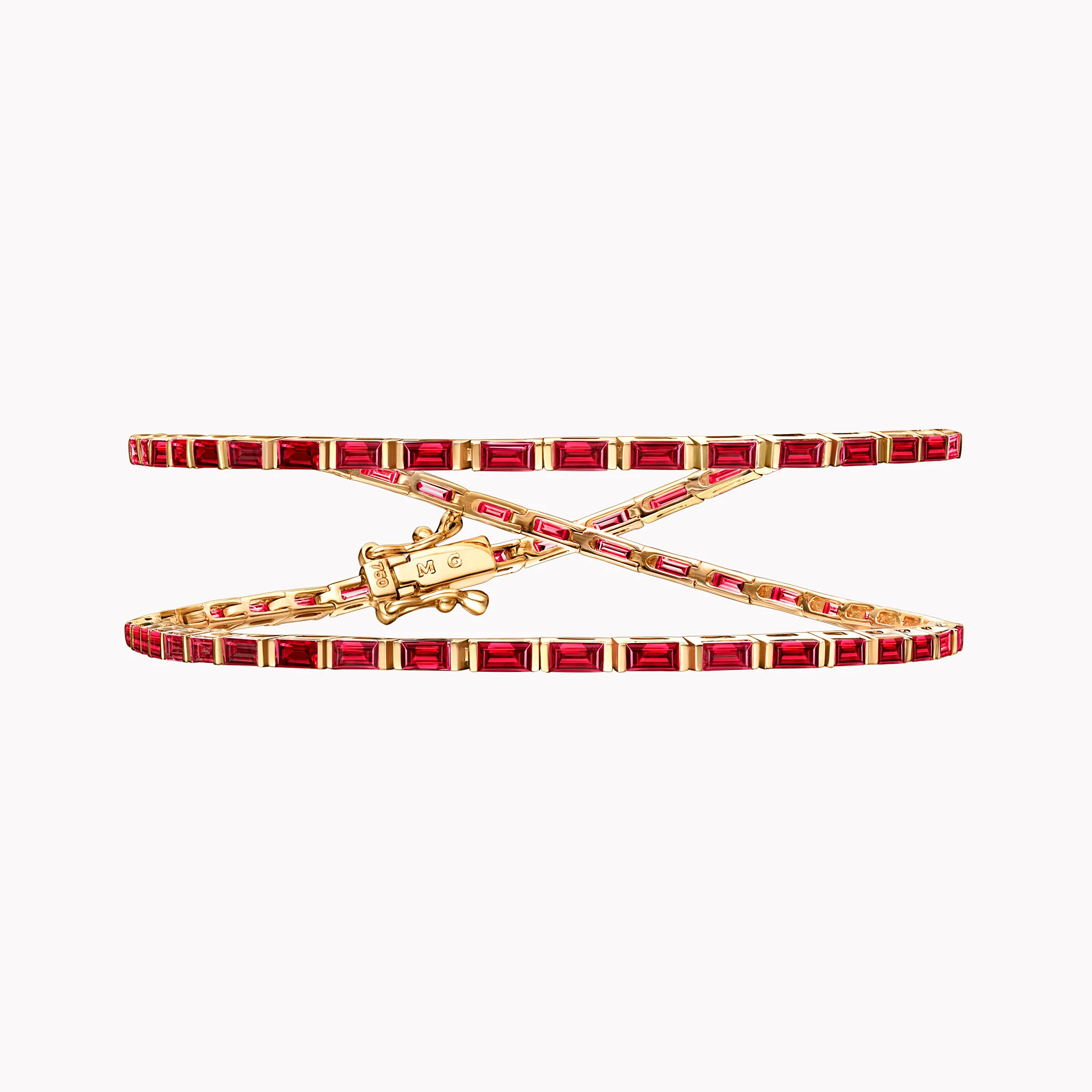 An MG Exclusive. This long wrap bracelet hosts 5.60 carats of baguette cut rubies set seamlessly in 18K yellow or rose gold. One of our most-loved designs, we redesigned the Maia wrap to include these vibrant gemstones. Each deep red ruby is offset by the unique gold setting, creating an unbroken line of simple elegance. This unique design wraps twice around the wrist to be worn as an elegantly draped bracelet, and doubles as a single row baguette sapphire choker.