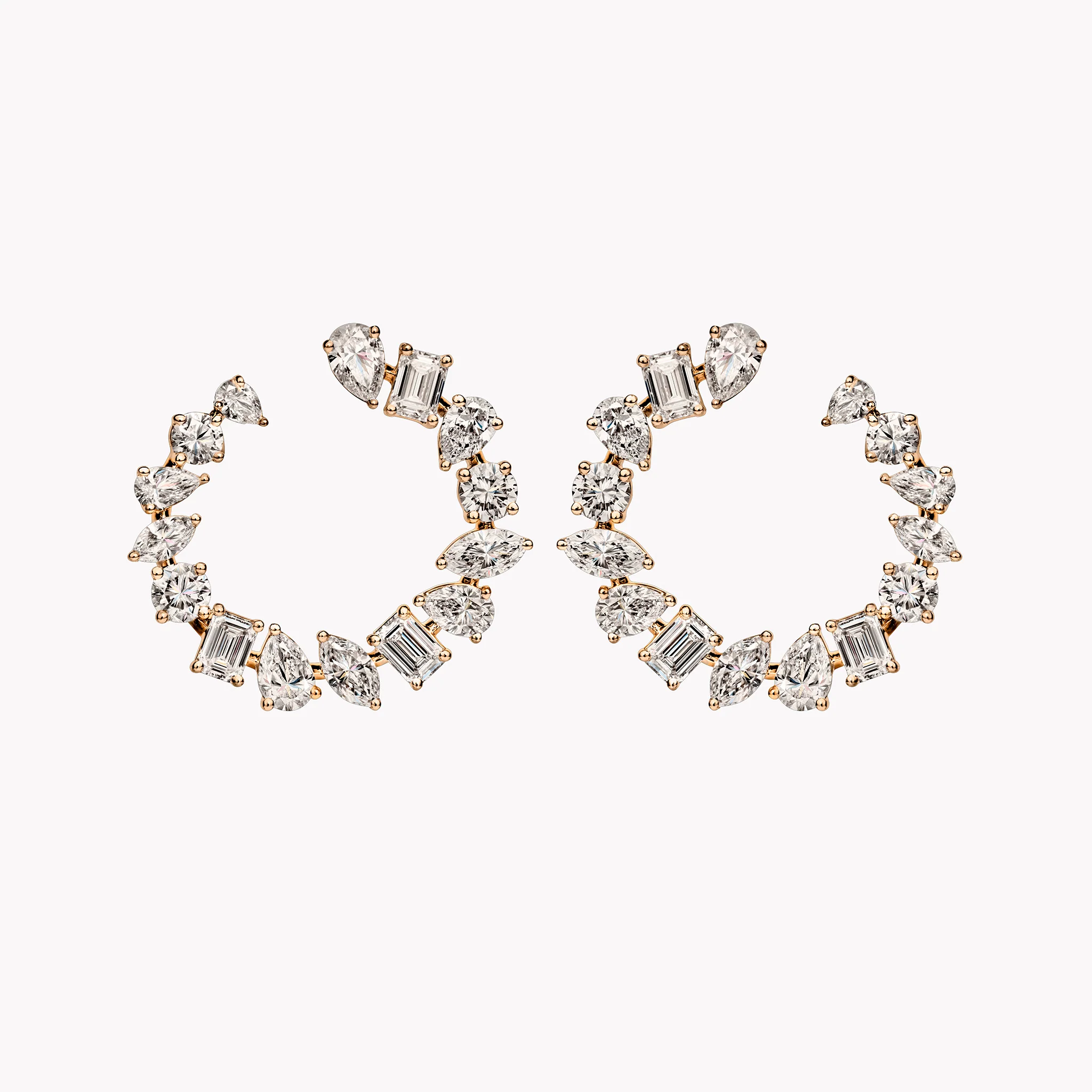 Our signature open hoop earrings with 30 multi-shape diamonds set in 18K white gold. These large hoop earrings feature 4.55 carats of diamonds and a ¾ inch diameter, a show-stopping look for day or night.